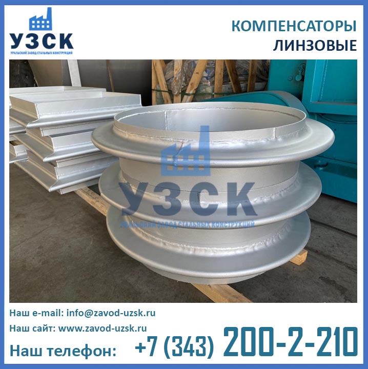 Все разновидности линзовых компенсаторов производятся на нашем заводе стальных конструкций. Особенностью этих изделий является соединение полулинз в широкой и узкой части. Здесь возникают напряжения, ослабляющие конструкцию. Изделия требуют выравнивания температурных напряжений в специальных печах. В корпус компенсаторов вмонтированы конденсатоотводчики, предупреждающие скопление жидкости в газовых магистралях.