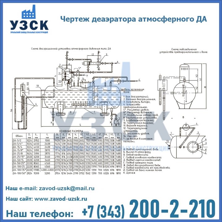 Приобрести качественное оборудование, в том числе, деаэраторы ДА, можно в компании УЗСК в Камышине. Мы предлагаем долговечную и надежную продукцию по приемлемой цене. Заказать и купить деаэраторы или другие изделия высокого качества можно через сайт Уральского Завода Стальных Конструкций, или позвонив по указанному в разделе «Контакты» телефону.